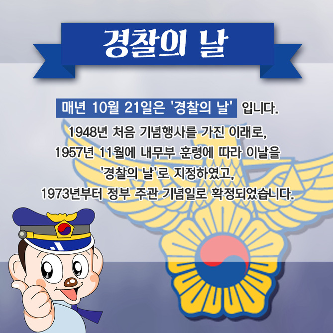 경찰의 날 매년 10월 21일로 이름만 들으면 단순히 경창들을 위한 날이라는 생각이 들 수 있다. 하지만 경찰의 날(10월 21일)은 대한민국의 기념일 중 하나이며, 민주 경찰로서 사명감을 일깨우고 국민과 더욱 친근해지며, 사회의 기강을 확립하고 질서를 유지하는 등 경찰의 임무를 재확인하고 경찰관의 노고를 치하하며 위로해 주는 데에 의의를 가진다.[1]