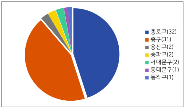 연구 대상에 포함된 작품들을 분석한 결과, 문학작품에서 드러난 경성의 장소들은 종로구 32개, 중구 31개, 용산구 2개, 송파구 2개, 서대문구 2개, 동대문구 1개, 동작구 1개 포함되는 것으로 확인되었다. 모던도시라고 불렸던 경성의 중심가, 본정을 중심으로 일제 지식인들이 활동했다는 것을 확인할 수 있는 부분이다.