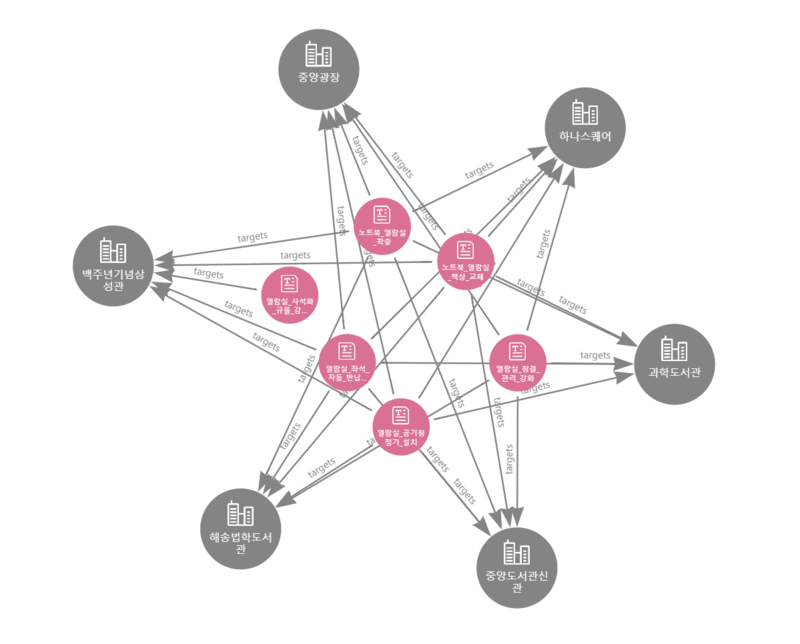 공약명에 ‘열람실’이 포함된 공약은 총 6개이며 열람실을 포함하는 건물인 ‘하나스퀘어’, ‘과학도서관’, ‘중앙광장’, ‘해송법학도서관’, ‘백주년기념삼성관’, ‘중앙도서관신관’에 총 30개의 많은 관계를 이루고 있다. [이를 보았을 때 학생들은 교내 열람실 시설에 많은 불만을 가지고 있으며, 총학생회는 공약을 통해서 이를 개선하려 노력한다는 것을 볼 수 있다. 또한 열람실과 관련하여서 ‘24시간 개방 건물 확대’, ‘휴게실 신설’과 같은 부가적 공약도 함께 제시하여 학생들의 편의를 더욱 증진하려 하였다.]