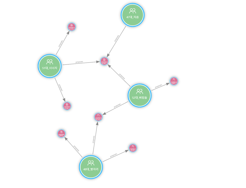 | KMK22KU | 🍻 | 교양 수업이었지만 전공 수업만큼 또 그 이상으로 시간을 쏟았던 수업이었다. 연구 중간 기존에 선정했던 주제에서 새로운 주제로 교체하는 과정을 거치며 시간 또한 그 만큼 부족했다. 이를 위해서 매주 3 차례 정도 2-3 시간 회의 진행을 해야할 만큼 많은 시간을 소비했다. 연구하는 주제가 공약인 만큼 수많은 페이지의 자료공략집을 각각의 공약으로 옮기는 데이터 수집 과정은 매우 고통스러웠다. 또한 각자가 작성한 공약의 이름을 같은 것으로 묶는 과정에서 매우 어려움을 겪었다. 하지만 이러한 과정 이후 neo4j에 넣어보고 그래프가 추출되는 것을 보고 많은 성취감을 느꼈다. 시간의 압박으로 인해 많은 아쉬움이 남는 연구이다. 좀 더 많은 양의 정보를 추출해보고 다양한 방면에서 분석을 할 수 있는 시간이 주어졌다면 더 의미 있는 연구를 할 수 있었을 것이라고 생각한다. |