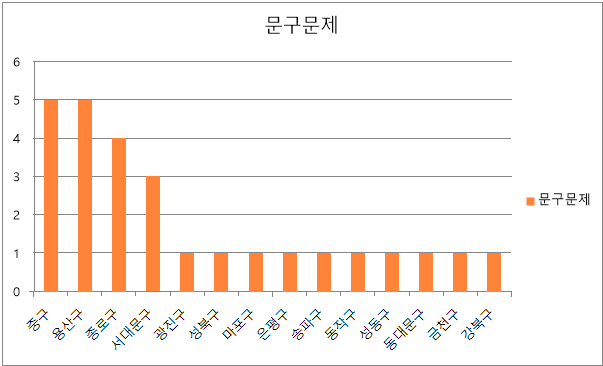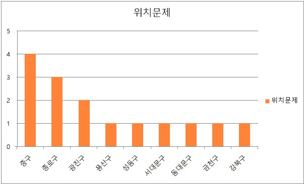 위치를 수정해야 하는 표석을 서울시 '구'별로 살펴 보았다. 중구가 4개로 가장 많았고, 그 다음이 종로구 3개, 광진구 2개였다. 용산구, 성동구, 서대문구, 동대문구, 금천구, 강북구는 각각 1개였다.