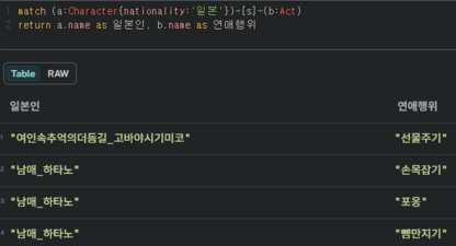 4. match (a:Character{nationality:'일본'})-[s]-(b:Act) return a.name as 일본, b.name as 연애행위