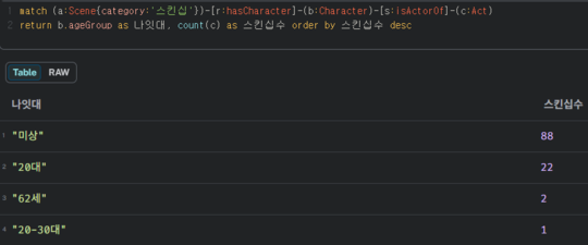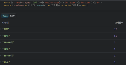 - 질의어: 1. match (a:Scene{category:'고백'})-[r:hasCharacter]-(b:Character)-[s:isActorOf]-(c:Act) return b.ageGroup as 나잇대, count(c) as 고백횟수 order by 고백횟수 desc
