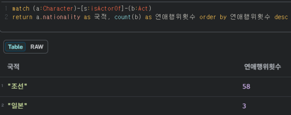 3. match (a:Character)-[s:isActorOf]-(b:Act) return a.nationality as 국적, count(b) as 연애행위횟수 order by 연애행위횟수 desc