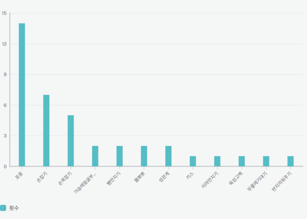 - 맥락: 가장 많이 활용된(표현된) 스킨십의 횟수를 통해, 작가들이 어떤 표현 방식을 많이 활용했는지 알아볼 수 있다.