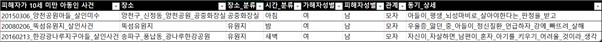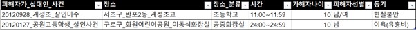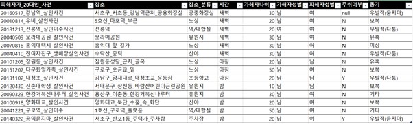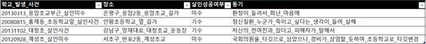 - (발생장소, 시각, 범행동기, 피해자-가해자 간의 관계 등 데이터 시트 정리 기준대로)