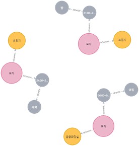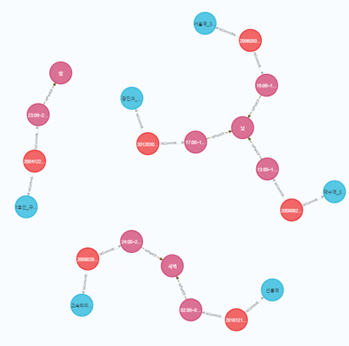 - 질의어: match(d:Time{type:'Hour_type'})<-[s:IsPartOf]- (c:Time{type:'Hour'})<-[t:IsCommittedAt]-(b:Case)-[r:IsCommittedIn]->(a:Place{category:'역/대합실'}) return b.name as 지하철_역_발생_사건, a.korname as 장소, b.success_type as 살인성공여부,b.motivation_details as 동기, c.name as 시간