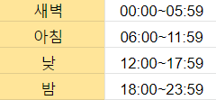 | IsPartOf | 일부이다 | Time | Time | 특정 시각은 새벽/아침/낮/밤의 일부이다 |