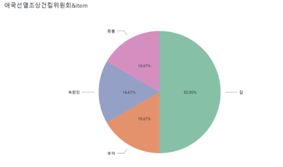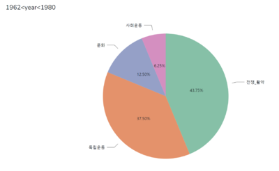 박정희 집권기에는 ‘전쟁_활약’과 관련된 인물들, ‘칼’/’무기’ 등의 item을 지니고 있는 동상의 건립이 집중적으로 나타나며, 애국선열조상건립위원회가 건립에 관여한 동상들의 다수가 같은 특징을 보이는 것으로 보아, 해당 단체의 동상 건립을 통해서 강인한/강력한 이미지를 만들고자 하였음을 짐작할 수 있다.
