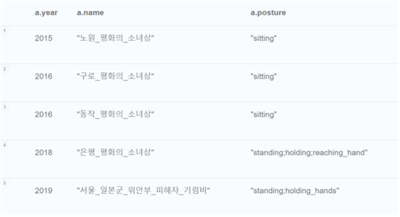 상위 3개의 소녀상들은 모두 ‘sitting’자세만을 보이고 있지만, 비교적 최근에 만들어진 은평 평화의 소녀상과 서울 일본군 위안부 피해자 기림비는 ‘standing’자세를 취하고 있으며, 손이나 다른 무언가를 잡고 있는 posture가 추가되었음을 알 수 있다.