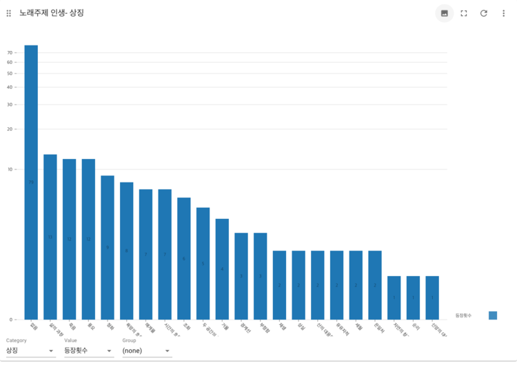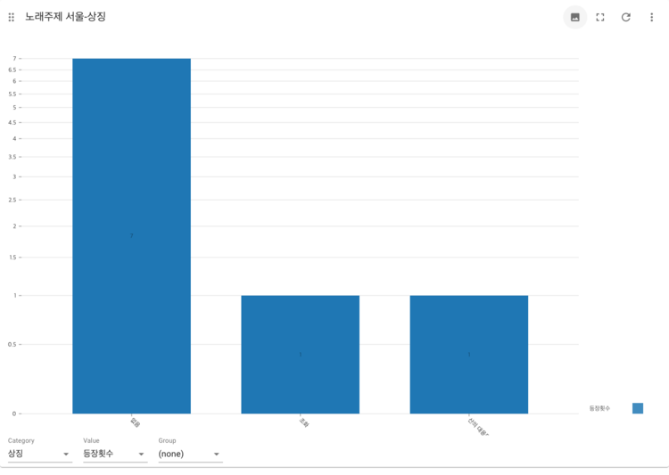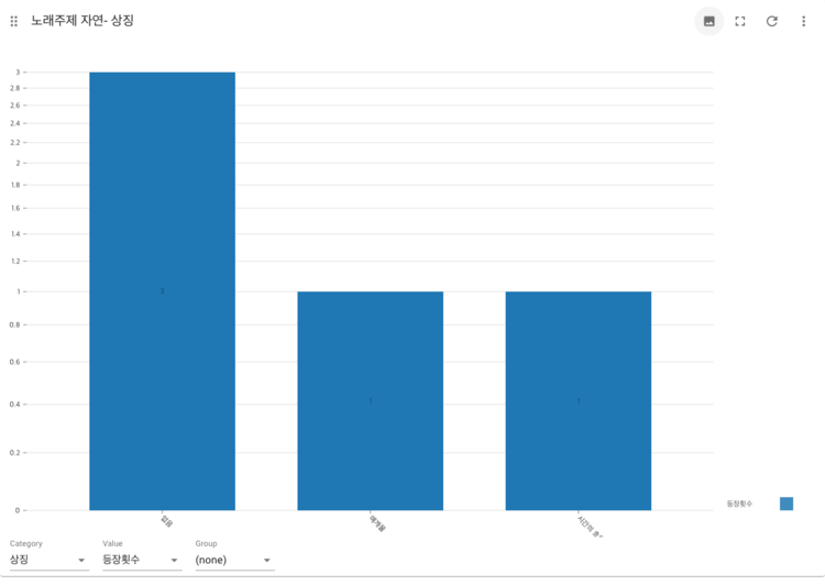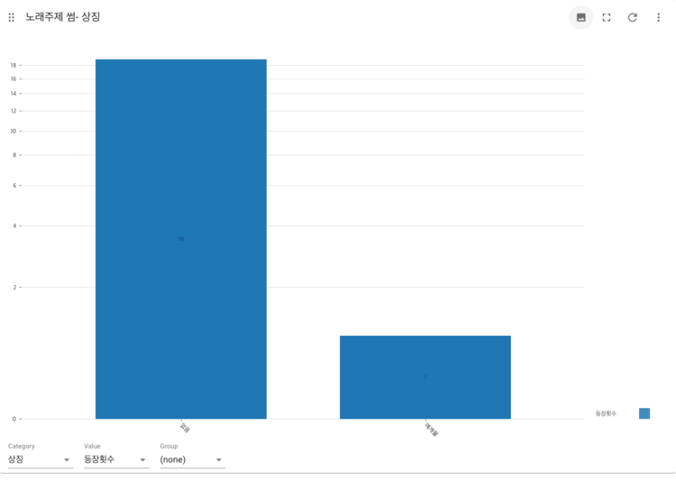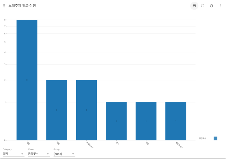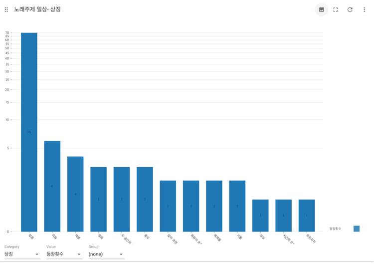 SongImage-symbol 앞서 한강의 이미지와 한강의 상징 사이의 관계성을 살펴보았으니, 노래의 주제와 한강의 상징 사이에 연관성이 있는지를 확인해보았다. 특정 한강의 이미지에 나타난 한강의 상징과 마찬가지로 노래의 주제가 '성공'인 경우에는 한강의 상징이 '풍요'인 경우가 그나마 많지만, '성공'을 제외한 나머지 주제에서는 한강의 상징이 '없음'인 경우가 압도적으로 많은 것을 확인할 수 있다. 특히 사랑, 이별, 인생, 일상, 자신감에서는 '없음'인 곡의 비율이 전체 곡에서 80%이상을 차지하는 것이 독특한데, 우리가 흔히 접하는 대중 가요의 주제에서는 한강의 이미지는 존재하더라도, 한강을 '강'이 가지고 있는 특성과 상징으로 활용하지는 않는다는 것을 파악할 수 있다.