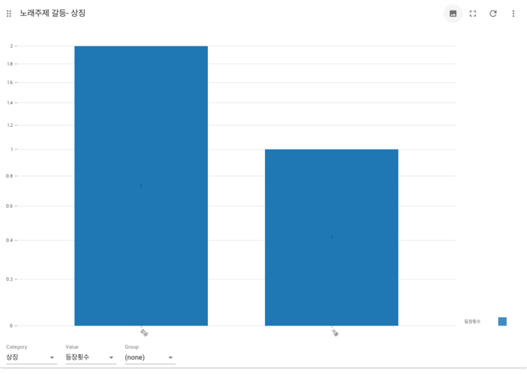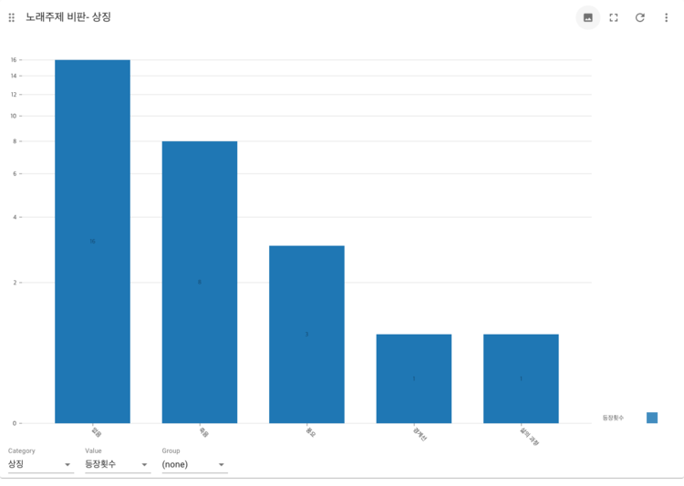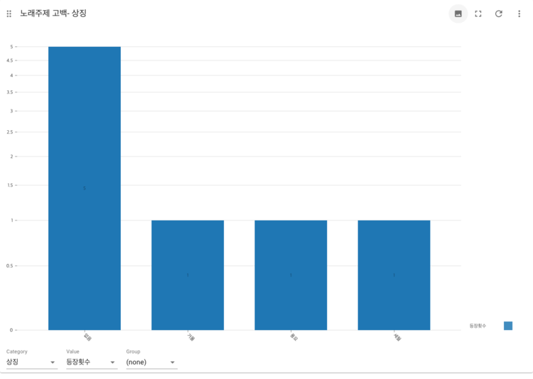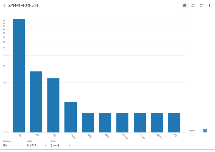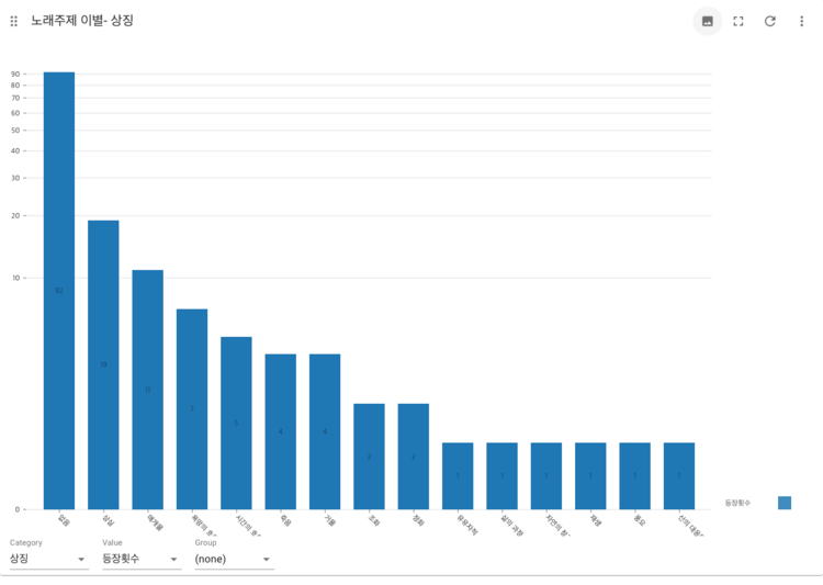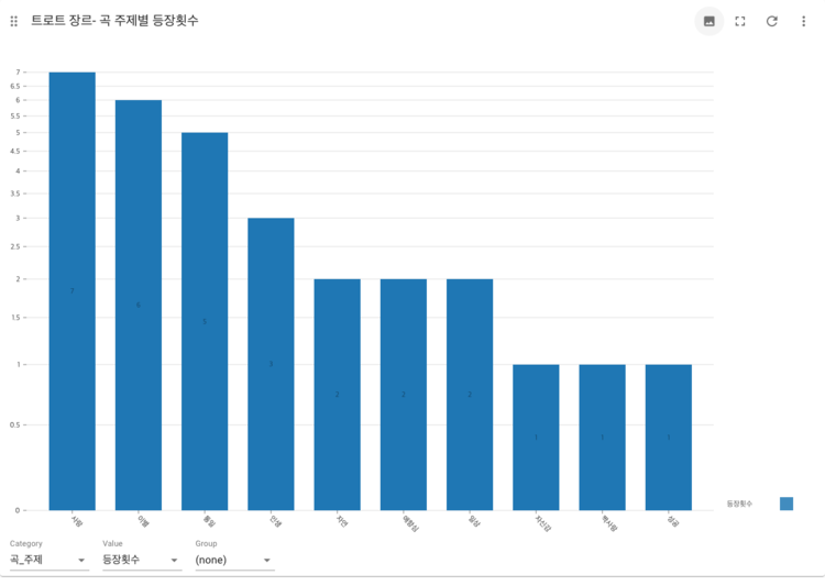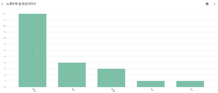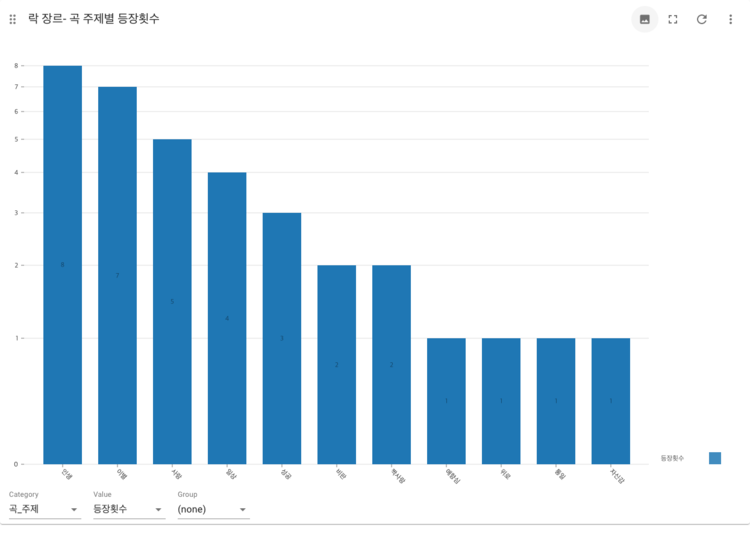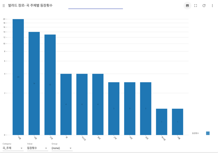 2.노래의 주제에서 사랑을 짝사랑. 이별. 썸 등으로 분류하고 나머지 부분을 사랑이라고 묶었는데 생각보다 주제가 뚜렷하게 드러나지 않는 노래들이 많았다. 대부분의 노래들이 사랑과 인생이라는 큰 묶음에 묶여서 나타나 결과 해석이 모호한 경우가 있다.