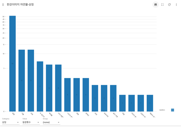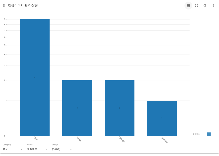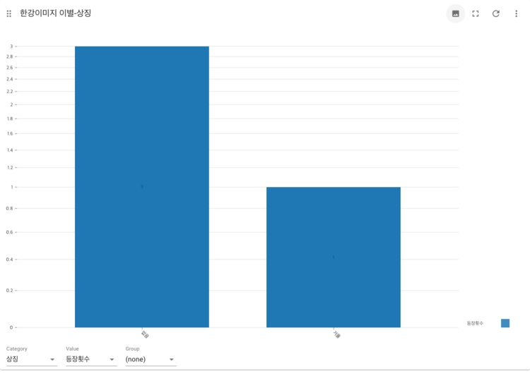 1.한강의 상징이 명확하게 드러나지 않는 부분에 대해서는 '없음'이라고 분류하였는데 결과에서 없음이 제일 많이 나타났다. 데이트와 같은 한강의 이미지에서 명확한 상징을 엿볼 수 없어서 만든 분류였는데 다른 상징들을 더 적극 활용하지 못했다.