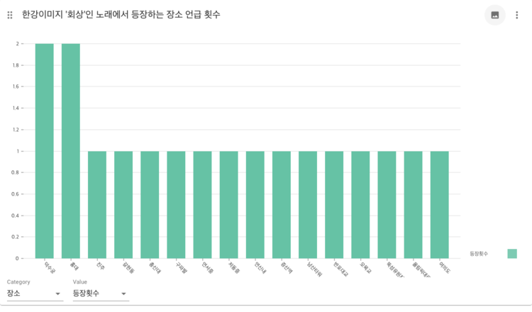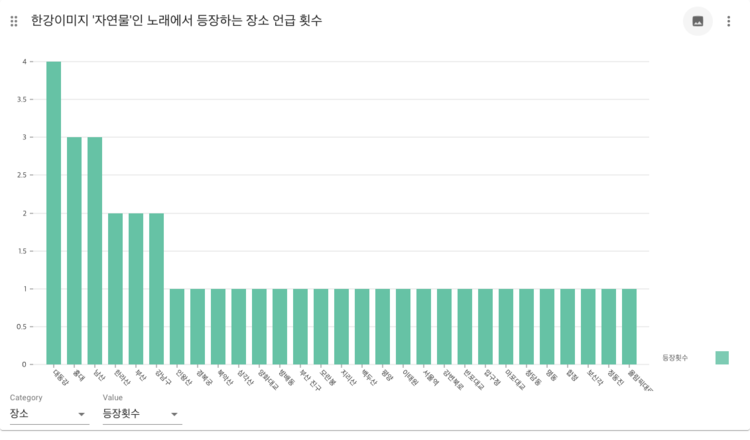 HanImage-place 다른 장소가 언급된 노래가 30곡 이상인 한강의 이미지는 데이트, 배경, 성공, 여가 자연물이었고 회상 18곡을 제외한 나머지 한강의 이미지는 10곡 미만으로 많은 데이터가 나오지는 않았다. 두드러지는 특징을 보이는 한강의 주제는 남한, 데이트, 자연물이었다. 한강의 이미지가 '남한'인 곡에서 언급된 장소는 분단, 북한과 관련된 평양, 대동강, 두만강이라는 점에서 관계성을 찾을 수 있었다. 한강의 이미지가 '데이트'인 곡에서 언급된 장소는 홍대, 이태원, 망원동, 남산 등 일반적으로 데이트 코스로 많이 알려진 장소가 같이 언급되었다는 점을 발견할 수 있었다. 한강의 이미지가 '자연물'인 곡에서는 남산, 한라산, 인왕산, 북악산, 삼각산, 모란봉, 지리산, 백두산 등 또 다른 자연물과의 관계성을 확인할 수 있었다. 하지만 이 세가지 이미지를 제외한 곡에서는 장소들 간의 공통된 특성을 발견하지 못하였으므로 전체적인 경향성은 파악하기 어려웠다.