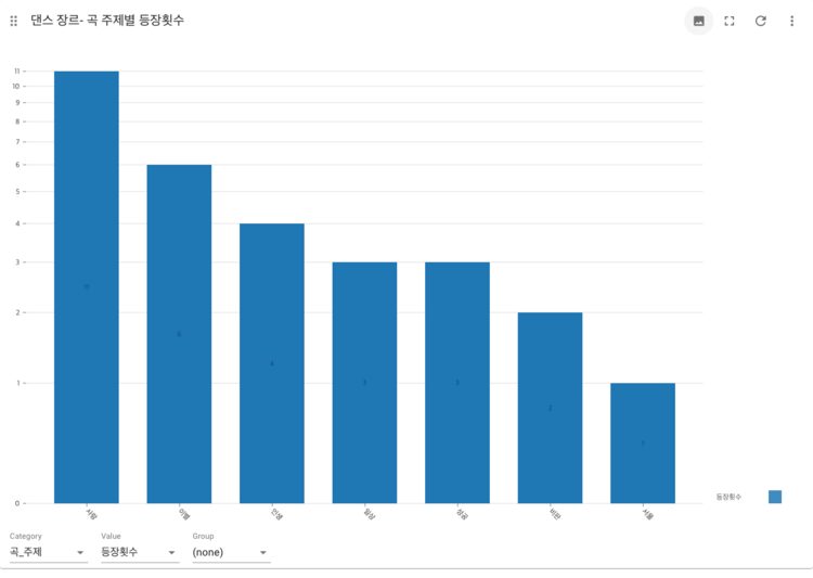 장르가 '댄스'인 노래 30곡 중에서 노래의 주제가 '사랑'인 곡은 11곡, '이별'인 곡은 6곡, '인생'인 곡은 4곡, '일상'과 '성공'인 곡은 각각 3곡씩, '비판'인 곡은 2곡, '서울'인 곡은 1곡 존재한다.