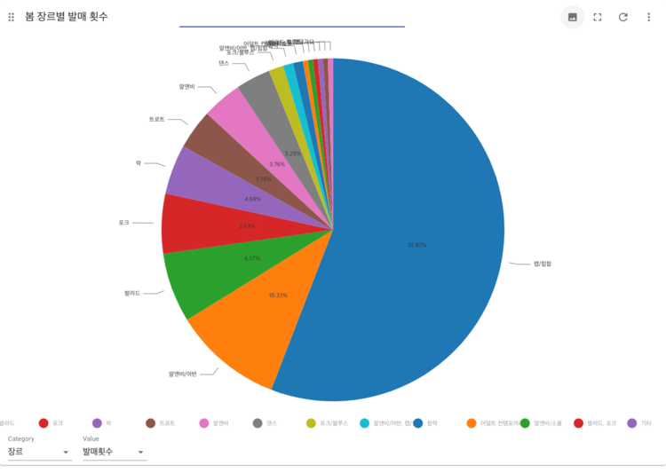 | 봄 | 랩/힙합(55.87%), 알앤비/어반(10.33%), 발라드(6.57%), 포크(5.63%), 락(4.69%), 트로트(3.76%), 알앤비(3.76%), 댄스(3.29%) |