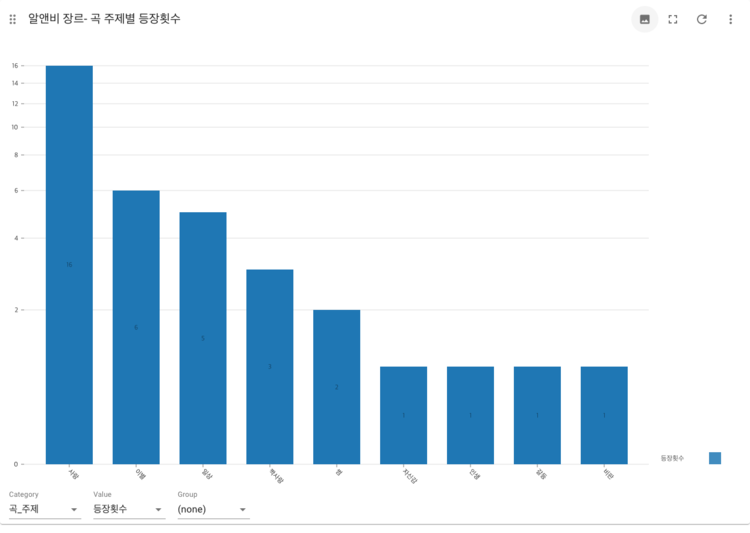 | 알앤비 | 사랑(16), 이별(6), 일상(5), 짝사랑(3), 썸(2), 자신감(1), 인생(1), 갈등(1), 비판(1) |