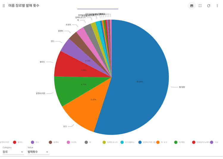 | 여름 | 랩/힙합(55.05%), 포크(11.47%), 알앤비/어반(8.72%), 발라드(7.34%), 댄스(4.13%) |