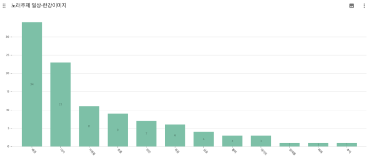 SongImage-HanImage 특정 노래 주제와 한강 이미지의 관계성을 살펴본 결과는 다음과 같다. 가장 많은 비율을 차지하는 사랑, 이별, 인생이야기를 살펴보면 주제가 사랑인 노래에서는 한강의 이미지가 데이트, 배경, 자연물은 경우가 가장 많다. 이별이 주제인 곡에서는 한강의 이미지가 배경, 데이트, 회상인 경우가 가장 많다. 이처럼 한강이 큰 의미를 가지지 않고 그저 공간적 배경을 활용되는 경우가 많음을 볼 수 있다. 노래주제가 인생인 경우에는 자연물, 배경, 성공, 흐름 등의 한강 이미지가 사용되었다. 여기에서 한강은 '강' 이라는 자연물로서 의미를 가지는 것을 볼 수 있다. 주제가 일상인 곳에서도 한강이 배경으로 가장 많이 사용되었다.