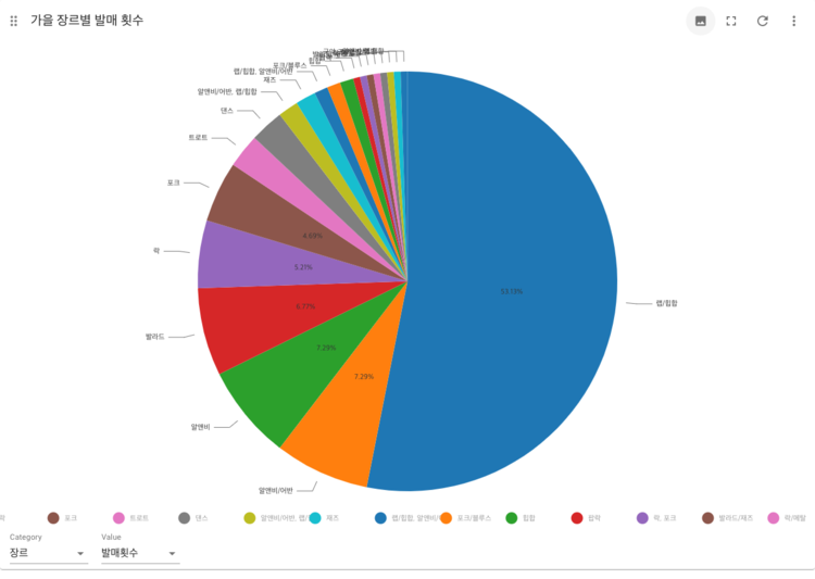 | 가을 | 랩/힙합(53.13%), 알앤비/어반(7.29%), 알앤비(7.29%), 발라드(6.77%), 락(5.21%), 포크(4.69%) |